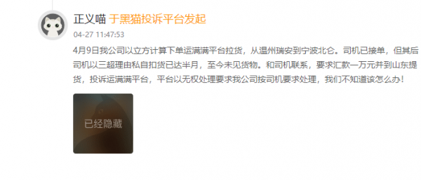 矛盾的另一端,货主群体同样承受着服务失控的风险。4月9日,某货主以立方计算下单运满满平台拉货,从温州瑞安到宁波北仓,司机接单后以三超理由私自扣货,和司机联系后,司机要求汇款一万元并到山东提货,货主向运满满平台投诉,平台表示无权处理并要求货主按照司机的要求来。