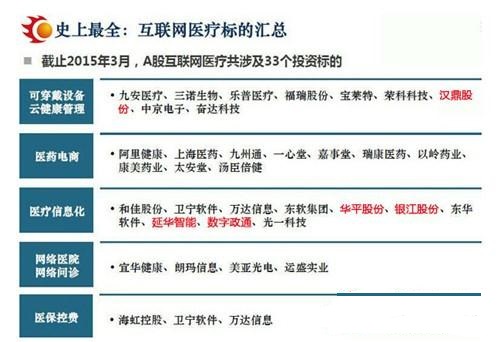 从上图可以看出,共33个A股互联网医疗投资标的,其中汉鼎股份、华平股份、银江股份、延华智能、数字政通这个五家上市企业在安防有相关业务。