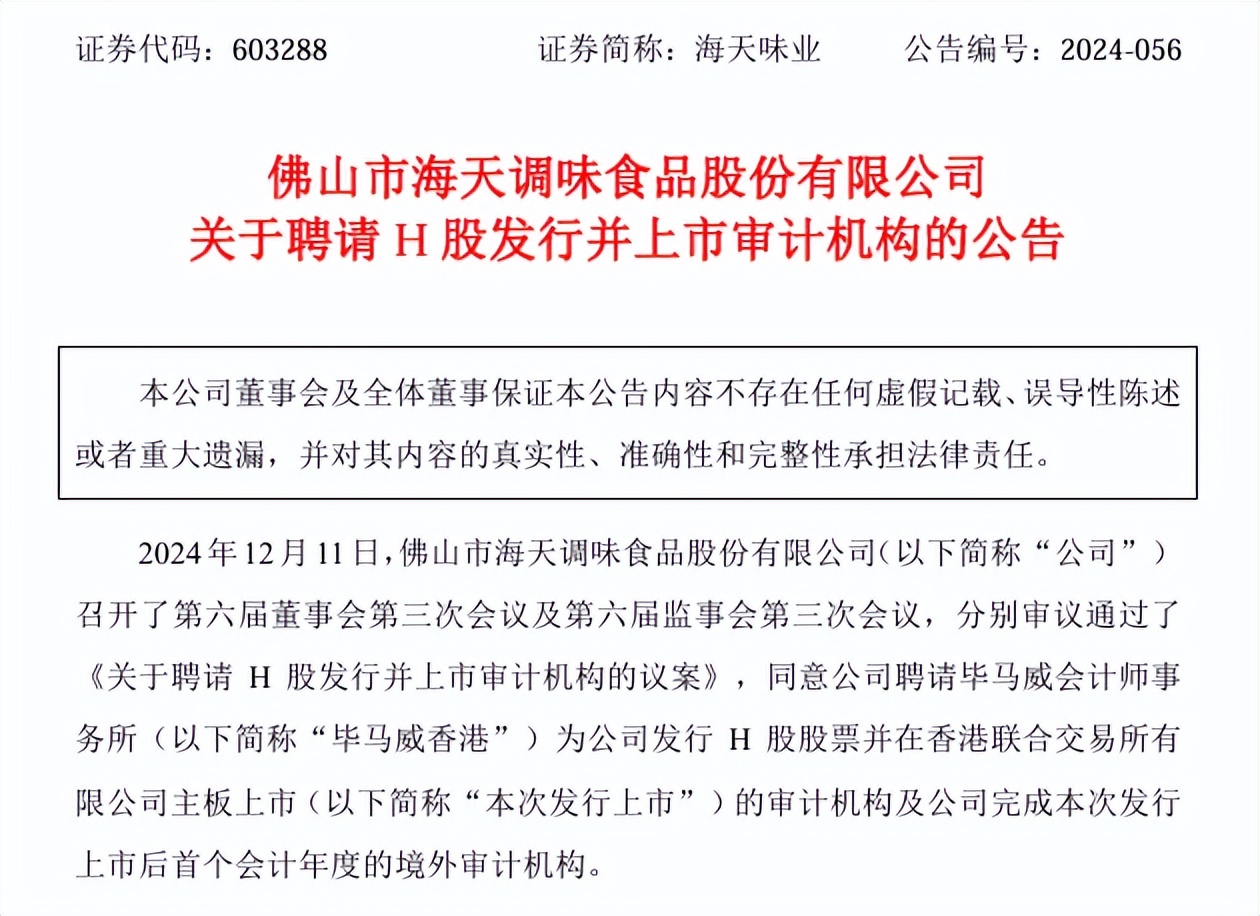 2024年12月,海天味业宣布,公司审议通过了《关于聘请H股发行并上市审计机构的议案》,同意公司聘请毕马威会计师事务所为公司发行H股股票并在香港联交所主板上市。