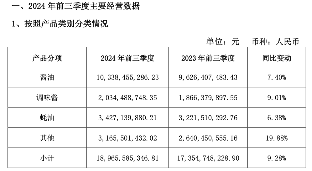 财报显示,2024年前三季度,海天味业其他类产品营收占比为16.69% | 来源:企业财报