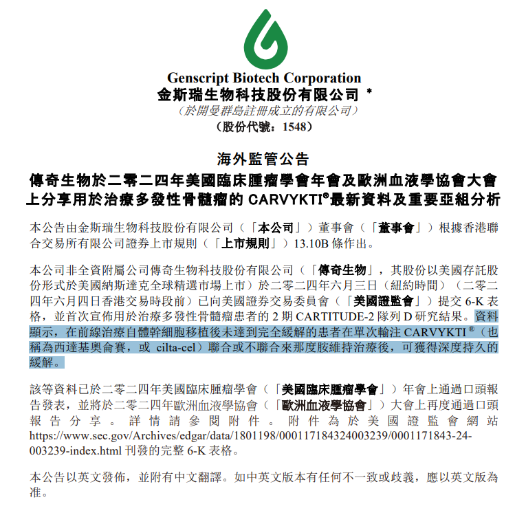 6月4日,金斯瑞生物科技发布的一则公告显示,其子公司传奇生物科技股份有限公司已向美国证券交易委员会提交了6-K表格,并首次宣布用于治疗多发性骨髓瘤的2期CARTITUDE-2队列D研究结果。