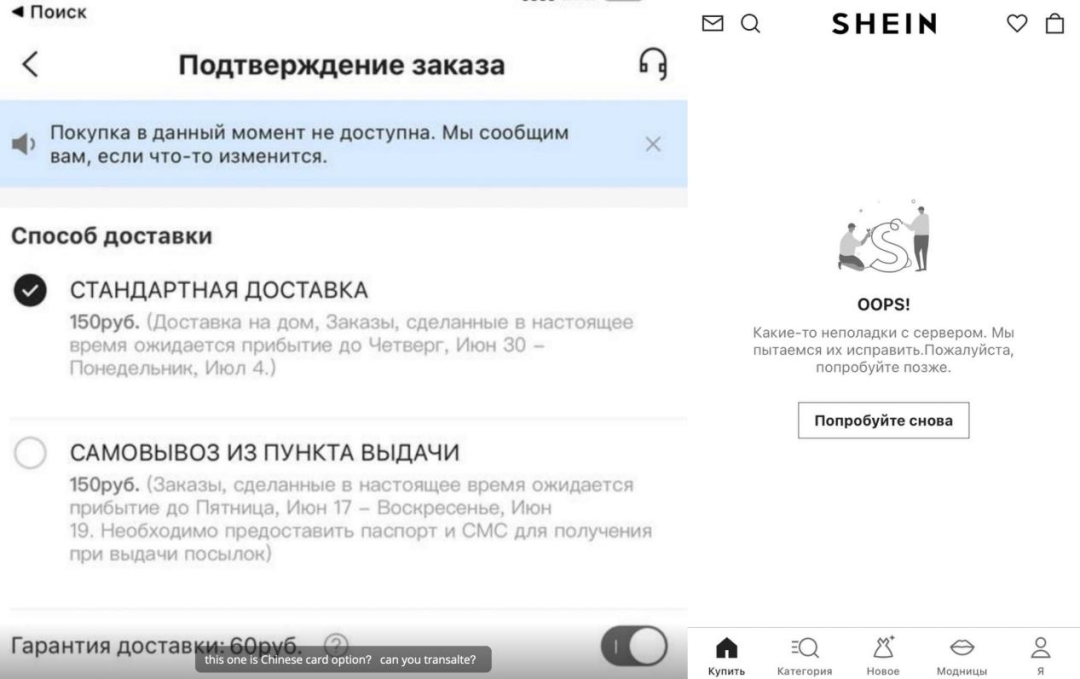 SHEIN的俄罗斯网站显示无法支付
