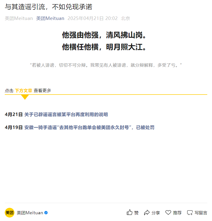 作为老牌玩家,美团在其自媒体账号发文称:“与其造谣引流,不如兑现承诺”。外界将其解读为对京东“在此我们也公开奉劝某平台”的回应。