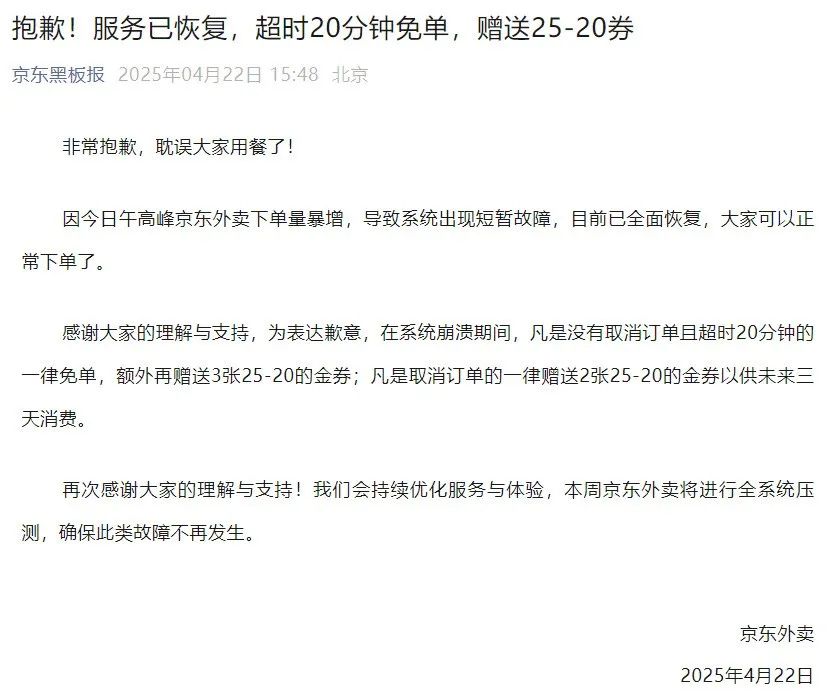 本月22日,京东外卖持续爆单,系统出现短暂故障,为表歉意,超时20分钟免单,赠送25-20券,或许京东都没想到外卖业务会这么受欢迎,否则早就提前扩容了。