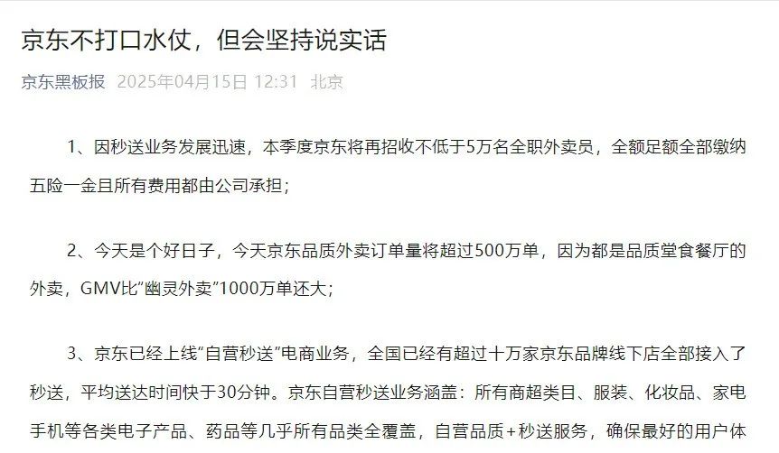 背后原因其实很简单,2月11日,京东外卖宣布,2025年5月1日前入驻的商家,全年免佣金,本月15日,京东发文称“今天是个好日子,今天京东品质外卖订单量将超过500万单,因为都是品质堂食餐厅的外卖,GMV比“幽灵外卖”1000万单还大”,并上线“自营秒送”电商业务,全国已经有超过十万家京东品牌线下店全部接入了秒送,平均送达时间快于30分钟。