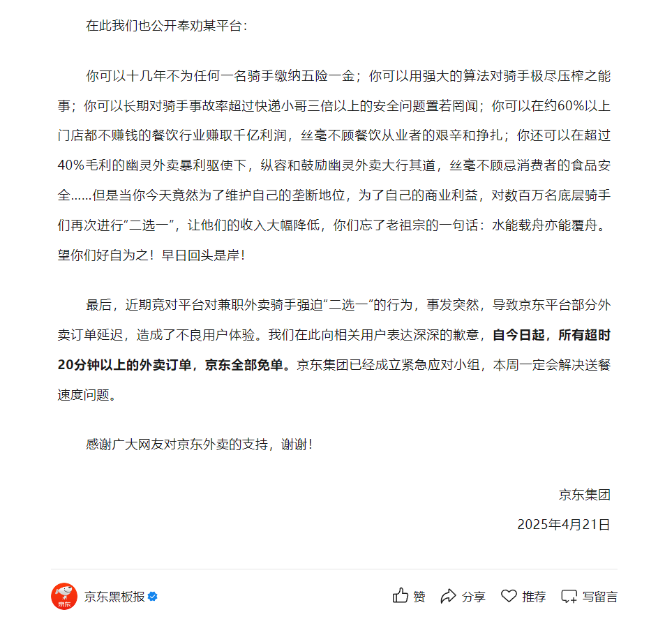 京东在公众号连发两份公开信,不仅为支持骑手自由接单、保障收入,推出多项举措,还加大全职骑手招聘力度,未来三个月将招聘名额由五万名提高到十万名。
