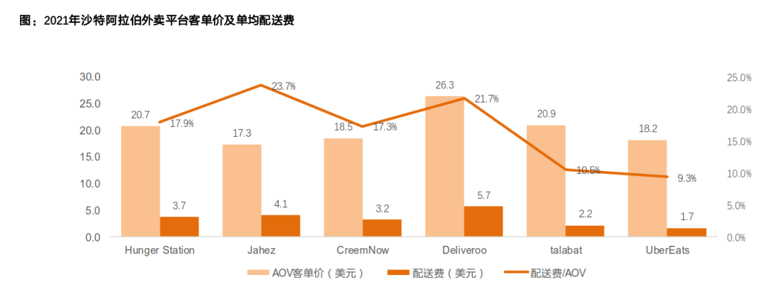 不过美团进军沙特外卖市场也并非坦途一片,目前沙特外卖平台集中度较高、基础设施成熟、消费力旺盛。主要头部平台Delivery Hero 旗下的 Hunger Station 和本土外卖平台Jahez在2021年分别占据45%和30%的市场份额,其余市场参与者还包括MRSOOL、Deliveroo等。