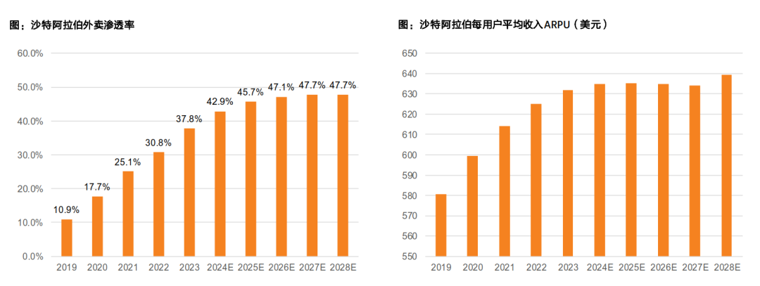 聚焦沙特市场,沙特外卖市场渗透率在后疫情时代快速提高。根据Statista披露的数据,预计2024年整年,沙特阿拉伯的外卖市场收入将达到101.9亿美元,外卖渗透率由2021年的25%迅速提高至2024年的42.9%,且未来有望提高至47.7%。经预测,沙特地区2024年的ARPU可达635美元,按照单均16美元测算,则年化人均可达约40单。