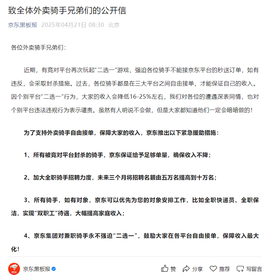 京东在公众号连发两份公开信,不仅为支持骑手自由接单、保障收入,推出多项举措,还加大全职骑手招聘力度,未来三个月将招聘名额由五万名提高到十万名。