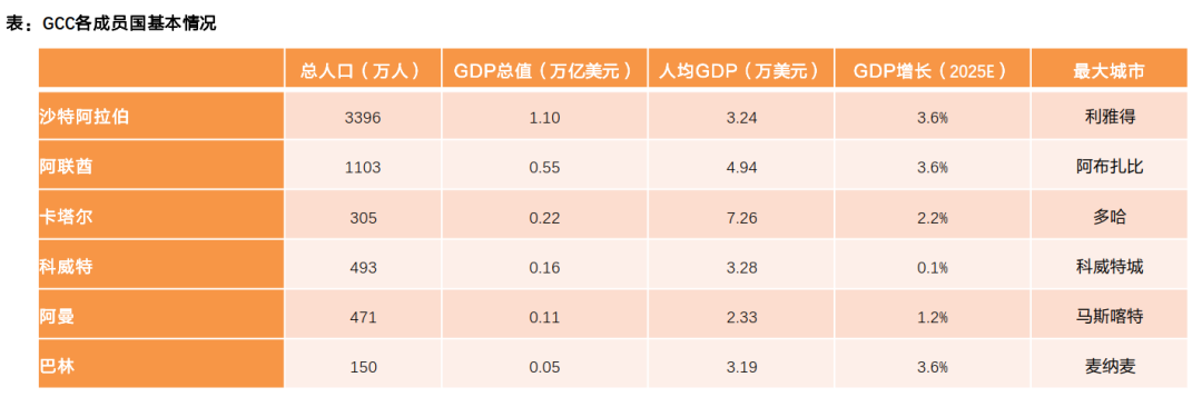 海湾六国,即海湾合作委员会(the Gulf Cooperation Council,简称GCC),包括沙特阿拉伯、阿联酋、卡塔尔、科威特、阿曼和巴林,是中东地区的重要组成部分。这一区域总面积达到了267万平方公里,总人口数约为近6000万人,人均GDP超3.6万美元。截止2024年12月,GCC地区GDP总值大约为2.19万亿美元,其中沙特阿拉伯是中东地区GDP最高的国家,达到了1.10万亿美元,为主要经济体。