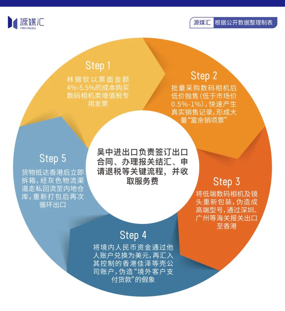 接着,林锡钦再将单价较低的低端数码相机及镜头重新包装,伪造成单价较高的高端型号,通过深圳、广州等海关报关出口至香港。随后,林锡钦将境内公司的人民币资金通过他人账户兑换为美元,再汇入其控制的香港佳泽等壳公司账户,伪造“境外客户支付货款”的假象。