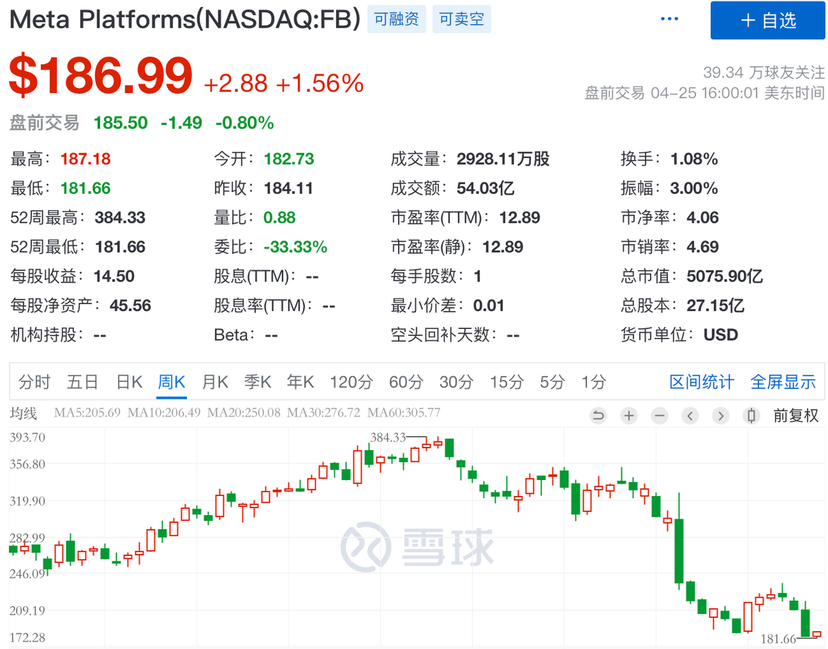 在美国科技富豪阵营中,财富缩水最严重的是Meta(Facebook)创始人扎克伯格。因业绩不及市场预期,2022年以来,Meta股价遭受重创,年内跌幅超过44%,总市值蒸发超过4055亿美元,导致扎克伯格的财富缩水超540亿美元(约合人民币3409亿元),而在2022年年初,其身家一度超过1200亿美元。