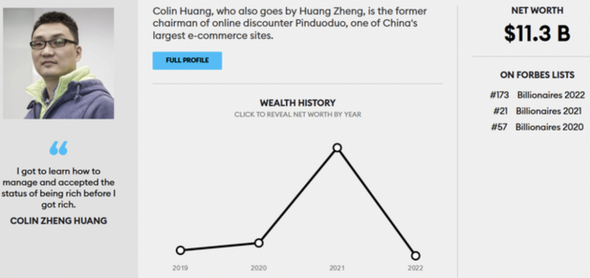 相比马云的1200亿元,拼多多创始人黄峥的财富缩水更为惨烈。据福布斯2022全球亿万富豪榜显示,黄峥的财富为113亿美元,排名下滑至第173位,相比2021年巅峰时刻的766亿美元,黄峥的财富缩水高达653亿美元(约合人民币4200亿元)。