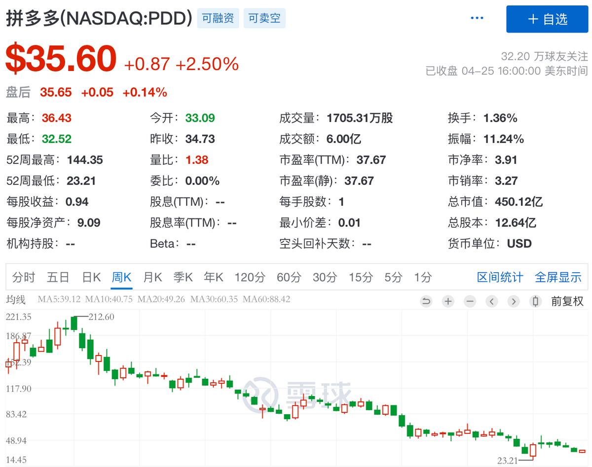 但此后拼多多股价一路走低,截至最新收盘,拼多多股价仅剩35.6美元,相比最高点的累计跌幅高达83%,总市值蒸发更是高达2237亿美元。