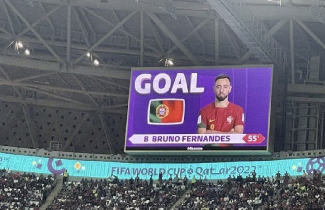 在世界杯小组赛葡萄牙击败乌拉圭的比赛进行到第54分钟时,B费传中后C罗做出头球动作成功破门,C罗也在赛场上欢呼,庆祝自己打破了纪录。不过,在赛场的大屏中却显示该进球归属于布鲁诺·费尔南德斯。