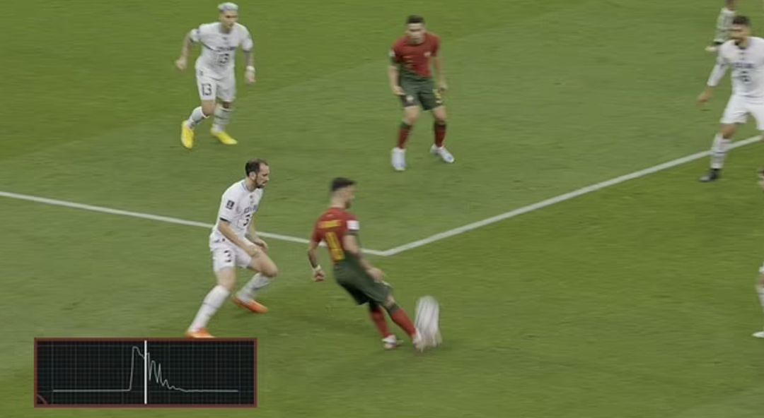 从上图左下角可以看出,当B费脚部碰到球时,IMU传感器的图像有了明显的波形变化。在阿迪达斯的官方声明中,其表示球内的500Hz的IMU传感器使分析能够非常准确。在葡萄牙和乌拉圭的比赛中,通过使用阿迪达斯官方比赛球中的互联球技术,阿迪达斯称其通过IMU传感器测量和所附的图形中缺乏“心跳”,无法测量到球上所受到的外部力,这也明确显示C罗在比赛中的首个进球中并没有真正接触到球。