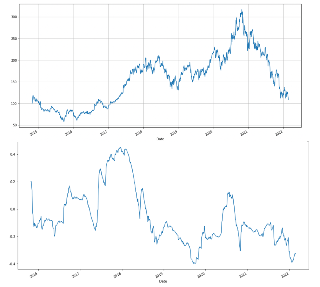 上图为阿里的股价走势情况,下图为股价与成交量的相关性,这一方面再三强化上述我们关于成交量在股价低迷时仍然稳定的判断,在历史上阿里股价下跌交易额一直与股价成负相关性,基石投资者的价值不言而喻,而更为重要的是,2018年末,2019年末在相关性上都呈现了拐点,也就是相关性向上,成交量带动股价。