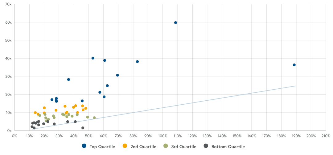 以美股BVP云计算指数为例,横轴的增速与纵轴的营收倍数乃是高度相关的,如今阿里云增速变缓,到了20%的同比,对其估值而言就面临了较大的不确定性。