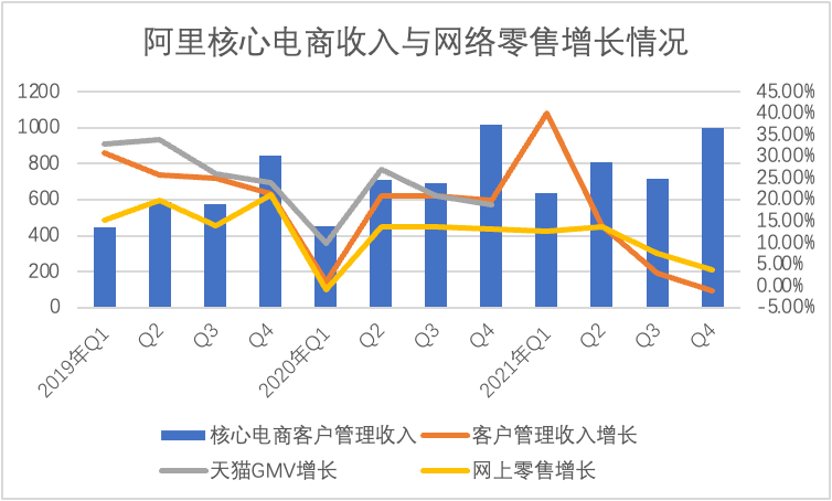 2021年Q4,阿里核心零售客户管理收入首次录得负增长,成为本季度财报最大的“亮点”,但当我们将拉长时间线,并加上天猫GMV和全国网上零售大盘的同比增长后,就又发现: