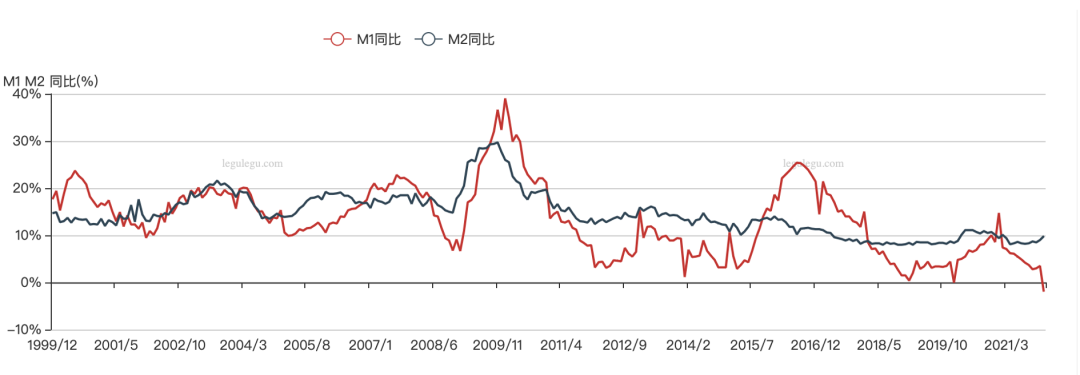 这是我国M1和M2同比增长情况,其中M1增长回到了历史的冰点,两者剪刀差放大,用经济现象解释数据则是:居民普遍“惜购”,活期存款持有量下降,转为流动性较弱的定期存款。