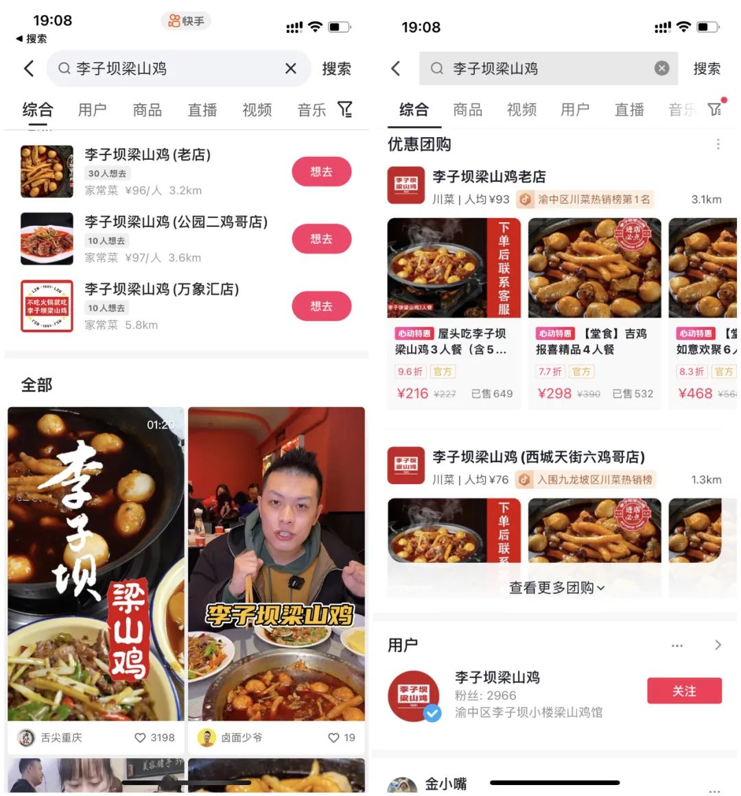 在没有开通外卖到家的城市,一些商家也抢先布局。号称重庆地标美食名片的“李子坝XX鸡”,目前商家没有入驻快手,只有少量网友上传的打卡视频,但商家却入驻了抖音,且有多种团购商品、团购到家和线下数十家门店定位展示。