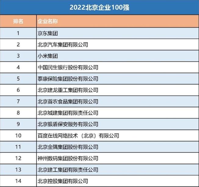 根据榜单显示,营收超1000亿元,排名前14家的企业分别是京东集团、北京汽车集团有限公司、小米集团、中国民生银行股份有限公司、泰康保险集团股份有限公司、北京建龙重工集团有限公司、北京首农食品集团有限公司、北京城建集团有限责任公司、北京银盾保安服务有限公司、百度在线网络技术有限公司、北京金隅集团股份有限公司、神州数码集团股份有限公司、北京建工集团有限责任公司、北京控股集团有限公司。