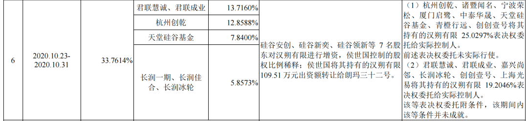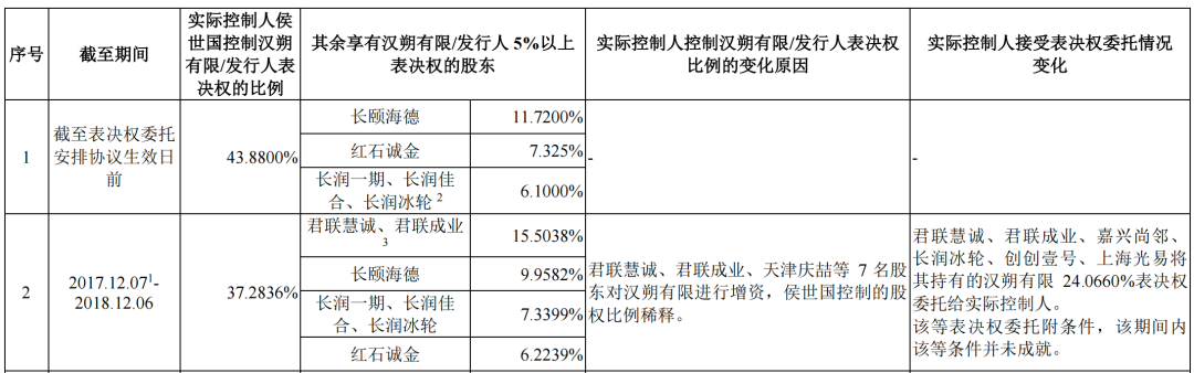 随着2017年君联慧诚、君联成业、天津庆喆等7名股东对汉朔有限进行增资,侯世国控制的股权比例稀释至37.28%,君联慧诚、君联成业、嘉兴尚邻、长润冰轮、创创壹号、上海光易将其持有的汉朔有限24.07%表决权委托给了侯世国。