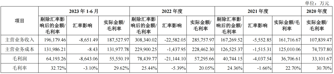 以2020年平均汇率来计算,剔除汇率影响后,2021年-2023年6月,汉朔科技营业收入分别为16.73亿元、30.83亿元、19.62亿元,受汇率影响分别减少收入5552.85万元、2.26亿元、8651.49万元。
