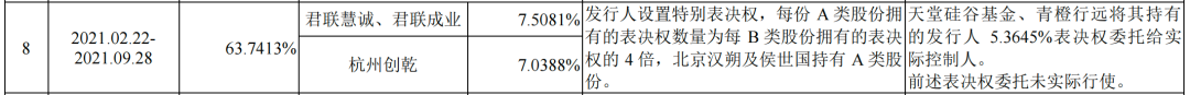 随着后续增资,以及侯世国将部分股权转让,其表决权比例进一步被稀释。2020年12月,汉朔有限整体变更为股份有限公司后,侯世国控制的表决权比例被稀释至33.76%,为了进一步加强实际控制人侯世国对发行人控制权的稳定性,2021年2月,汉朔科技设置特别表决权股份,经特别表决权安排侯世国的表决权比例升至63.74%。