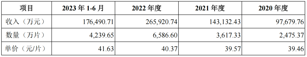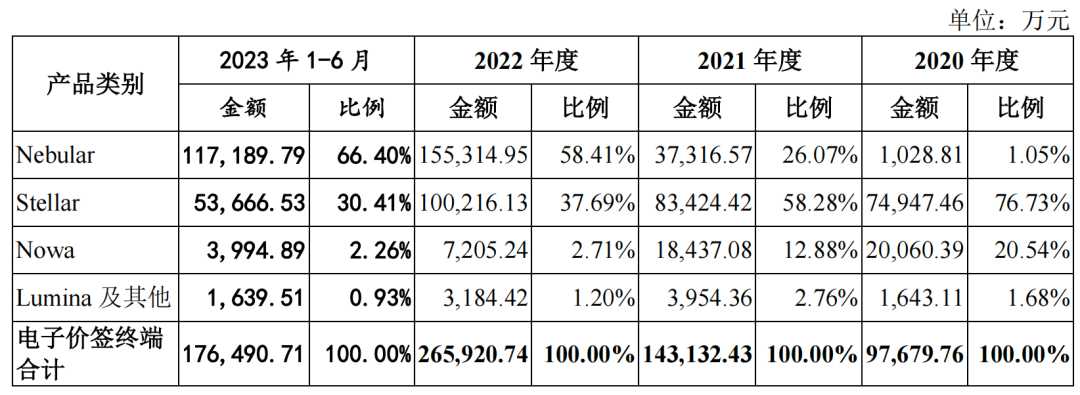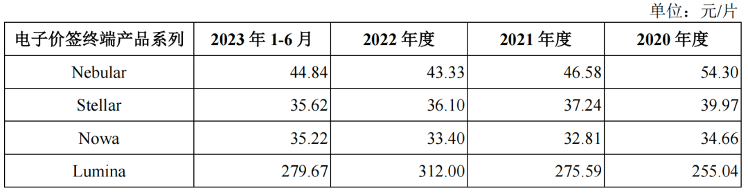 汉朔科技的收入主要来自电子价签的贡献,报告期内,其电子价签终端产品平均单价分别为39.46元/片、39.57元/片、40.37元/片、41.63元/片,保持稳中略升,带来整体销售收入9.77亿元、14.31亿元、26.59亿元、17.65亿元,占主营业务收入的比例分别为90.58%、88.51%、93.06%,94.11%。