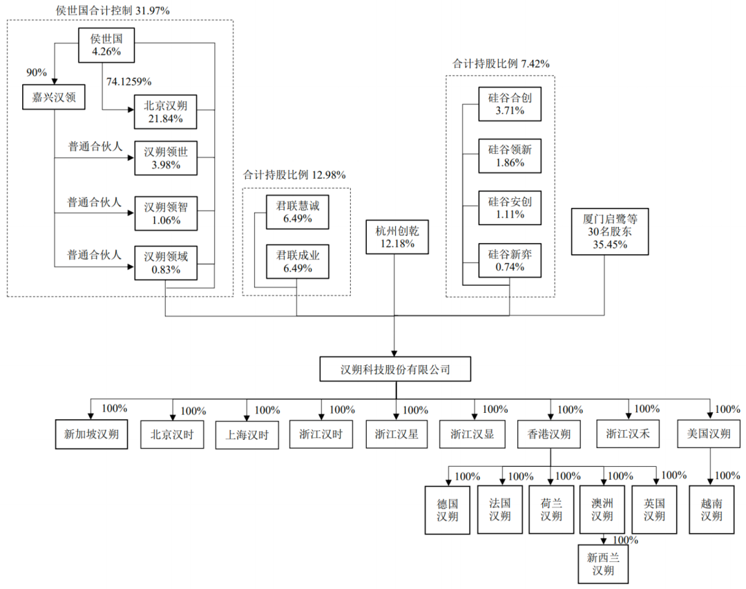 北京汉朔作为第一大股东及控股股东,持股21.84%;侯世国持股4.26%,通过实际控制的北京汉朔、汉朔领世、汉朔领域、汉朔领智,合计控制31.97%的股权,为实控人。
