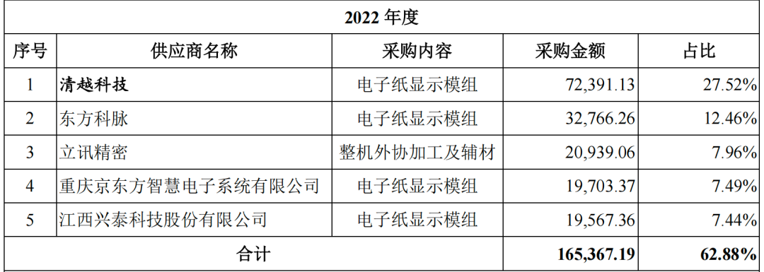 不过汉朔科技存在与主要供应商东方科脉数据披露不一致的情况。汉朔科技主要向东方科脉采购电子纸显示模组,2020年-2022年东方科脉分别为其第一、第一、第二大供应商,发生采购金额31528.79万元、29323.81万元、32766.26万元。