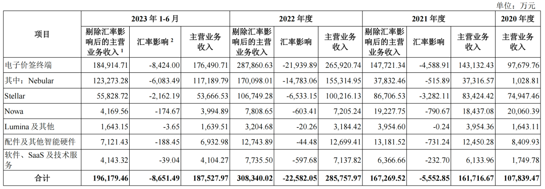 汉朔科技电子价签终端产品主要包括Nebular、Stellar、Nowa、Lumina四大系列,产品主要销往国外,多以欧元、美元、澳元等外币结算,但受汇率、推广优惠等因素影响,销售收入和毛利率波动较大。报告期各期,汉朔科技营业收入中境外收入占比分别为79.01%、76.10%、93.04%、96.47%。