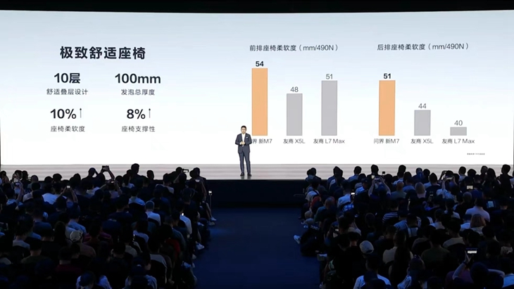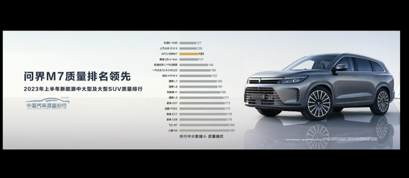余承东在演讲中引用了2023年上半年中国新能源中大型和大型SUV质量排行榜的数据,证明了问界M7的卓越表现。根据这一排名,问界M7车型荣获第三名,仅次于红旗汽车的红旗E-HS9和上汽大众的ID.6 X。它的得分与奥迪的奥迪Q5 e-tron持平,遥遥领先凯迪拉克LYRIQ锐歌、一汽大众ID.6 CROZZ、高合HIPHI X、理想L7、理想L8、阿维塔11、蔚来ES7、岚图FREE、蔚来EC7、蔚来ES8、飞凡R7和小鹏G9等车型。