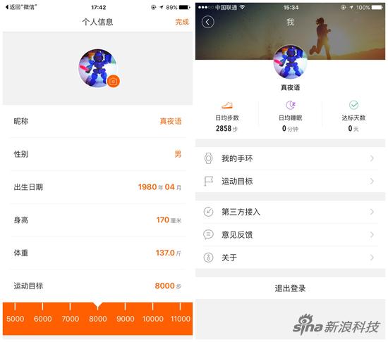 点入个人属性界面,可以看到日均步数、睡眠及达标天数等统计数据,还可查看手环数据及更改运动目标,设置第三方接入。在手环数据页面,能查看手环电量、查找手环、更改佩戴方式、固件升级、解绑手环。第三方接入则包括腾讯微信及苹果健康。