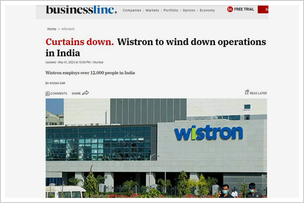 如今,据《印度商业在线》消息,纬创计划全面撤出印度市场,并向印度国家公司法庭、公司注册处提出一年内解散其在印度业务。