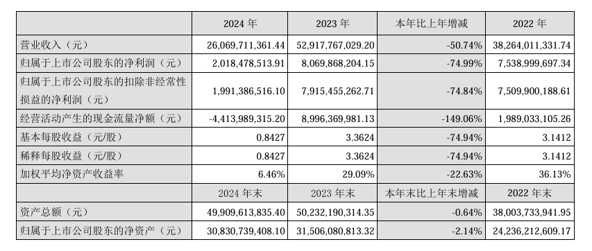 近日,疫苗行业头部企业智飞生物公布了最新财报,寒意明显:2024年,公司实现营业收入260.7亿元,同比下降50.74%;归母净利润20.18亿元,同比下降74.99%;归母扣非净利润19.91亿元,同比下降74.84%。