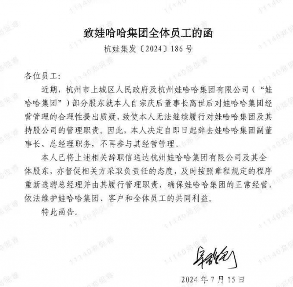 上述文件显示,宗馥莉已将相关辞职信送达娃哈哈集团及其全体股东,亦督促相关方采取负责任的态度,及时按照章程规定的程序重新选聘总经理并由其履行管理职责,确保娃哈哈集团的正常经营,依法维护娃哈哈集团、客户和全体员工的共同利益。