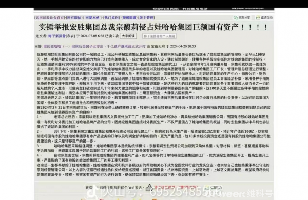 该举报信称,宗馥莉在宗庆后去世后继承了娃哈哈集团的管理权,使用各种手段抓住对娃哈哈集团的控制权。