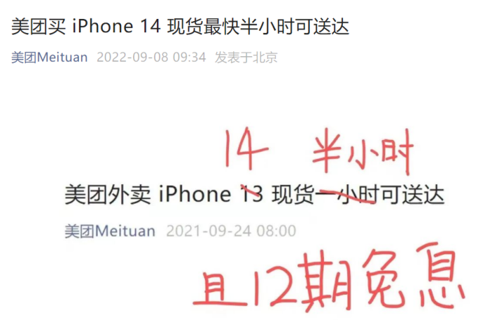 9月8日晚,苹果发布iPhone14系列,第二天中午,朋友圈就被美团外卖支持半小时送货的消息刷屏。想在第一时间拿到新品的用户,通过在美团外卖搜索“iPhone ”,即可进入当地Apple 授权专营店,线上下单后,骑手最快30分钟送达。同时,美团还附加了一些福利,用户购买iPhone 14将免配送费,部分用户还可以享受最长12期免息分期服务。