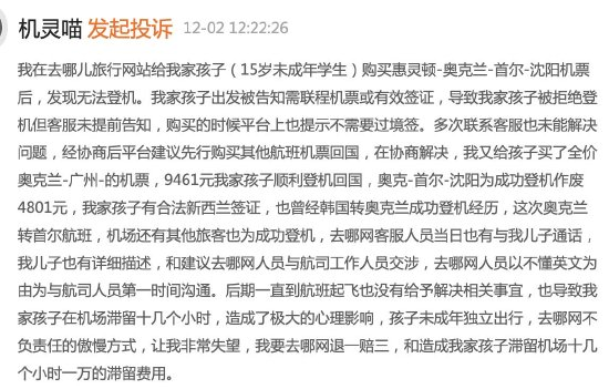 沈阳的韩先生投诉称,他通过去哪儿网给自己孩子(15岁未成年学生)购买11月30惠灵顿-奥克兰-首尔-沈阳的机票。惠灵顿-奥克兰-首尔的行程航司为新西兰航空公司,首尔-沈阳的机票航司为南方航空公司。在抵达奥克兰机场时,孩子却被告知需联程机票或韩国有效签证,否则无法登机。