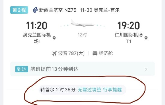 韩先生表示,孩子有合法新西兰签证,之前也有过从国内去往奥克兰在首尔转机的经历,同时在购买机票的时候,去哪儿网曾提示不需要过境签,并且奥克兰当地机场称此机票非联程票。