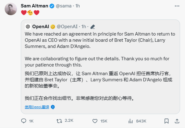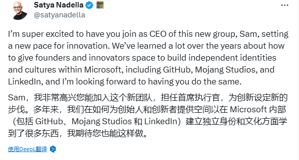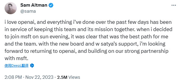 此外,Sam Altman也发贴称:”我喜欢Openai,一直以来我所做的一切都是为了让这个团队及其使命保持一致。当我收到微软的邀请时,那时我相信这是对我和团队最有利的选择。不过在新董事会和Satya的支持下,我期待着继续为OpenAI工作,并深化我们与微软的战略合作关系。“