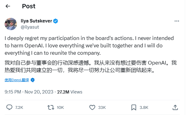 此外,IIya Sutskever还在推特上表示自己非常后悔参与驱逐Altman的行为,他不希望OpenAI四分五裂。