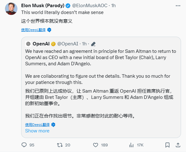 有趣的是,Elon Musk也转发推文,并且颇有幽默意味地说:”这个世界根本没有意义。“以此来调侃OpenAI这场毫无意义的闹剧。