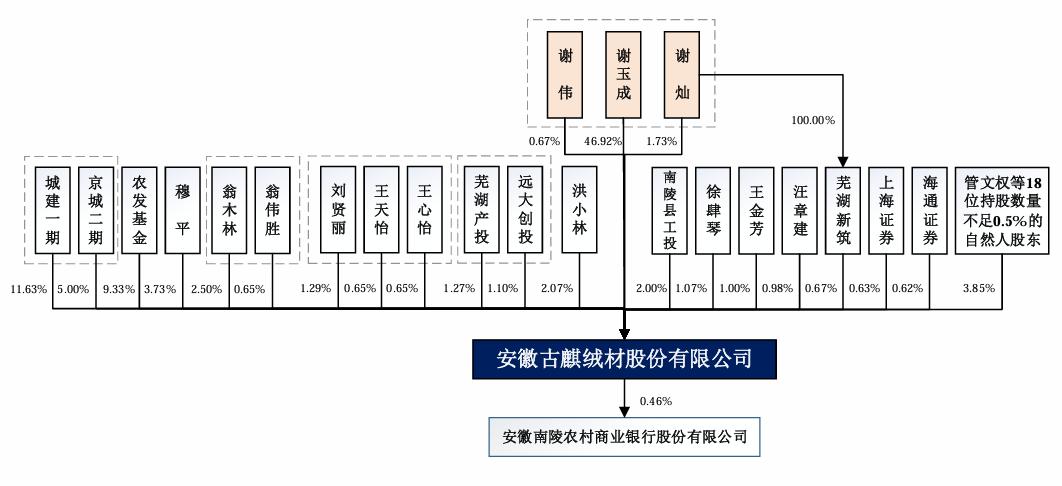 截至本招股说明书签署日,古麒绒材董事长兼总经理谢玉成直接持有该公司46.92%的股份,为控股股东;谢玉成之女、古麒绒材副总经理兼董事会秘书谢伟直接持股0.67%,父女二人合计持股47.58%,为古麒绒材的实际控制人。