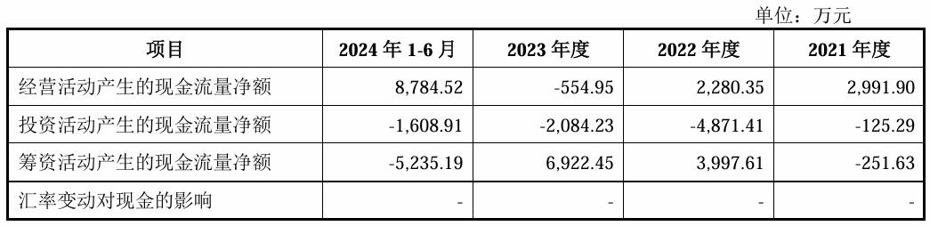 同时,由于应收账款和存货占用了大量的营运资金,古麒绒材的资金面也不算充足,报告期各期经营活动产生的现金流量净额分别为2991.90万元、2280.35万元、-554.95万元和8784.52万元,在2023年出现了现金流出。
