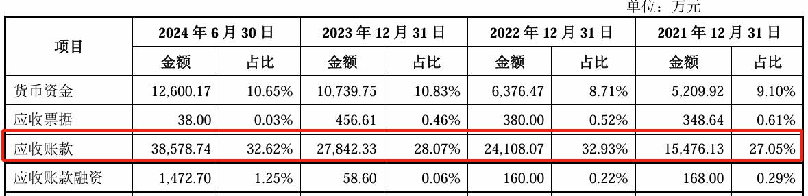 过度依赖大客户不仅会带来单一销售风险,随着经营规模的扩大,古麒绒材的应收账款规模也由2021年末的1.55亿元增至2024年6月末的3.86亿元,占流动资产的比例更是达到32.62%,其中账龄在1年以内的应收账款占比超过85%。