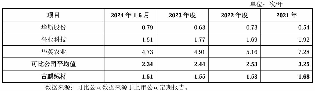 2021年、2022年、2023年度和2024年上半年,古麒绒材的存货周转率分别为1.68次、1.53次、1.55次和1.51次,明显低于同行业可比公司3.25次、2.53次、2.44次和2.34次的平均值,存货管理效率仍有待优化。