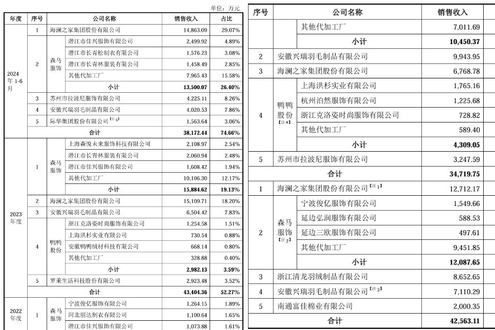 其中,前两大客户海澜之家、森马服饰及其代工厂称得上是古麒绒材的核心收入来源,二者同期内的销售总额分别达到了2.48亿元、1.72亿元、3.10亿元和2.84亿元,2024年6月末占总收入的比例已超过50%。